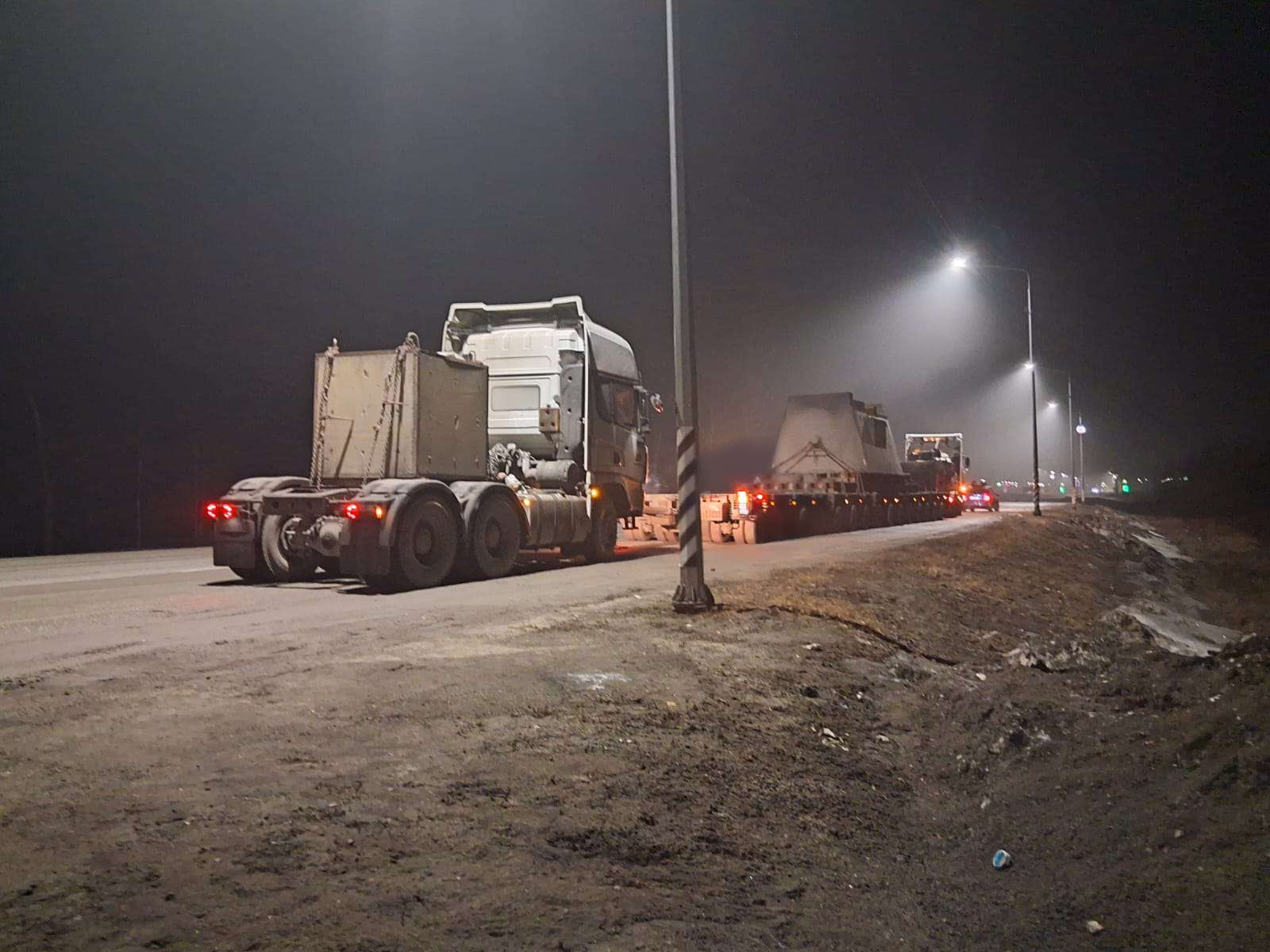 Для выполнения такой перевозки использовался модульный автопоезд и балластный тягач. Длина автопоезда составила 45,2 метров (тягач + 16 осей модуля).